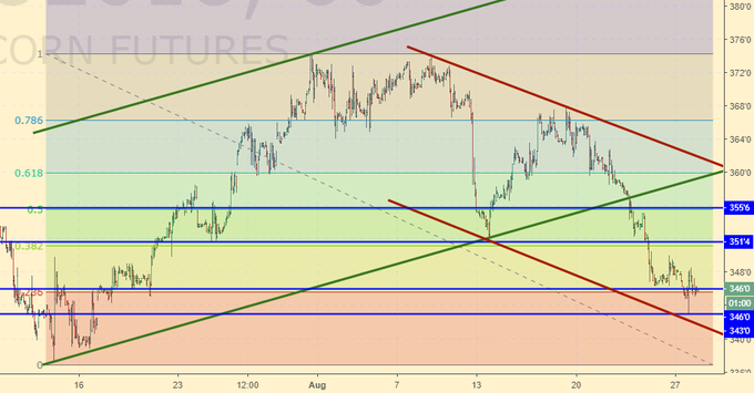 Кукуруза: вчера писали: «не хватает только удара вниз и мгновенного отскока (длинной тени), тогда бы ход вверх смотрелся бы куда лучше, а так медвежья атака выглядит немного незавершенной». Просили, получите. Видим удар вниз. Теперь самое время навалиться всей гурьбой и отодвинуть рынок от 346.0 для начала чуть выше 350.0. Покупаем. Шортисты поджимают стоп ордера, как бы чего не вышло.