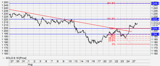 Золото: по золоту наметился разворот. Рынок поднялся за вчерашний день еще на несколько долларов достигнув отметки 1214.8. Вероятнее всего, мы сегодня увидим 1220, далее последует возврат к 1210, после чего рост будет продолжен вплоть до 1250. У золота, если смотреть очень большие масштабы, была идея падения к 900 (это максимум 1980 года), но и от 1100 разворот возможен. А где-то там, наверху, пусть и не скоро, светит нам отметка 3400 (три тысячи четыреста). Это надо учитывать.