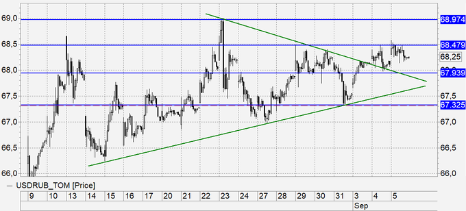 Рубль: мы продолжаем стоять над 68.00, что оставляет преимущество за быками по доллару. Что происходит? Все большее количество покупателей входит в рынок, размещая свои стоп-ордера под 68.00. Хороший медведь попытается вскрыть такое дело, при условии, что он рассчитывает на поддержку единомышленников. Однако смельчаков не находится, даже тех, кому хватило бы хода к 67.00. В силу складывающейся технической картины и заявленных намерений ЦБ продолжать скупку долларов в сентябре, рекомендуем только покупки.