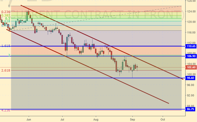 Сценарий роста: рассматриваем сентябрьский фьючерс, дата экспирации 18 сентября. Можно опираясь на отскок от 98.60 войти в лонг со стоп-ордером на 101.00. В том случае, если рынок возьмет 108.00 – рекомендуем добавить к покупкам.