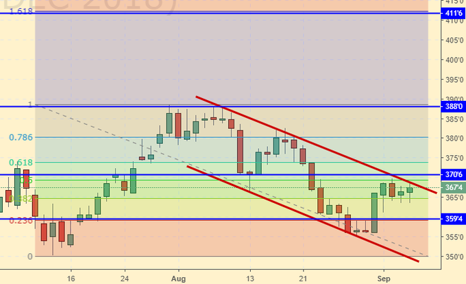 Сценарий роста: рассматриваем декабрьский фьючерс, дата экспирации 14 декабря. Быкам надо просто удерживать рынок на текущих уровнях, и как только цены с течением времени выйдут из падающего канала, мы отправимся на 388.0. Ждем закрытия рынка выше 371.0 и покупаем.