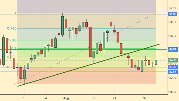 Сценарий роста: рассматриваем сентябрьский фьючерс, дата экспирации 14 декабря. Быки создали себе поддержку на 835.0, что делает привлекательным покупки с текущих уровней. В случае закрытия какого-либо дня выше 851.0 – купить.