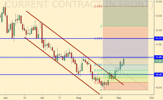 Сценарий роста: рассматриваем октябрьский фьючерс, дата экспирации 28 сентября. Уровень 11.05, как окончание импульса вверх, поставлен нами ориентировочно, на самом деле цена может подняться еще на несколько центов прежде, чем мы увидим откат из-за частичной фиксации прибыли. Этим откатом могут воспользоваться те, кто не торопился покупать ранее.