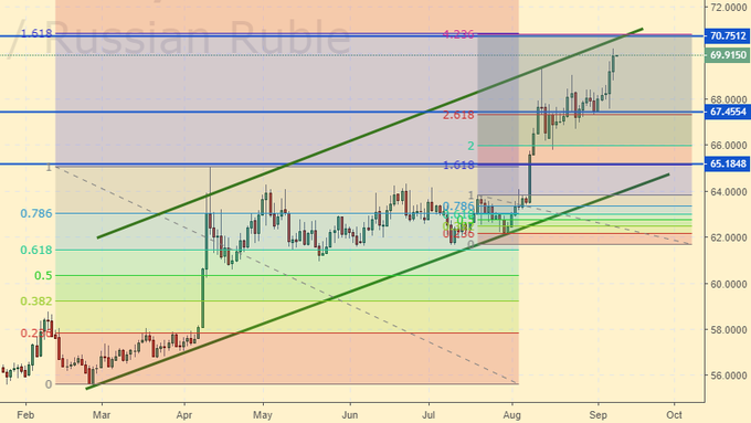 Сценарий роста: мы должны дойти до 70.70 в понедельник. Затем будет откат к 68.00 до пятницы. В пятницу ЦБ РФ поднимет ставку на 0,25% процента, а поскольку это ясно заранее, мы, после объявления этого решения, продолжим штурмовать новые максимумы. Вывод: купить от 68.00.