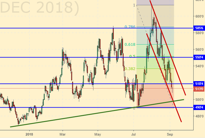 Сценарий падения: медведи пока побеждают. И наши шорты вместе с ними. Из-за перекладки из контракта в контракт, все уровни стали выше на 30 центов. Ситуация складывается так, что если вы нарастили продажи от 550.0, то на 513.0 можно и подумать о фиксации половины прибыли. Ход на 450.0 напрашивается, но учитывая не блестящие данные по урожаю, он все же вряд ли состоится.