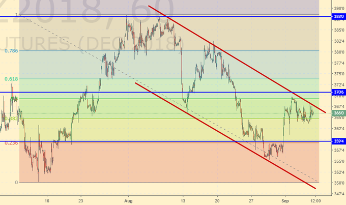 Кукуруза: продолжаем держаться в районе 365.0, что постепенно склоняет вероятность в пользу роста. Если котировкам удастся вырасти выше 370.0 на рынок придет новая волна покупателей, которые продолжат толкать его к 400.0. Но здесь хотелось бы видеть движение вверх и по пшенице, так как если его не будет, то кукуруза одна далеко не уйдет.