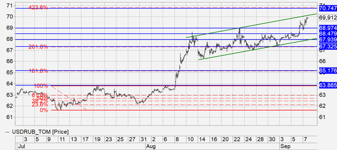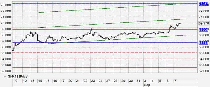 Продажа: возможна при касании 70700. Стоп: 70900. Цель: 69000 (68000).