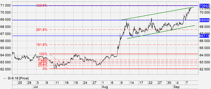 Продажа: возможна при касании 70700. Стоп: 70900. Цель: 69000 (68000).