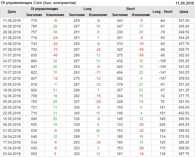 Рост на рынке пшеницы способствовал небольшому росту фьючерсов на кукурузу, но ожидания крупного урожая в США сдерживали попытки ралли. После небольшого роста благодаря поддержке со стороны пшеницы, кукуруза все же закончила неделю в минусе. Декабрьские фьючерсы упали на 1,6% на этой неделе. За пятницу сентябрьские фьючерсы прибавили 0,75 цента до 3,37 долл., в то время как декабрьские фьючерсы выросли на 1,25 цента до 3,5175 долл. США. За неделю спекулянты добавили 3 958 контрактов по кукурузе к своей чистой короткой позиции, увеличив ее до 86 528.