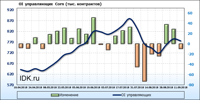 За прошлую неделю, 03.09.18 — 07.09.18, разница между длинными и короткими позициями производителей и управляющих упала на 3 тыс. контрактов. За отчетный период времени, цена выросла на 2 цента. Разница совокупного объема длинных и коротких позиций производителей и управляющих на прошедшей неделе снизилась, в то время как цены выросли. Рынок теряет доверие покупателей, что, при продолжении данной динамики, приведет к стабилизации или падению цен в ближайшее время.