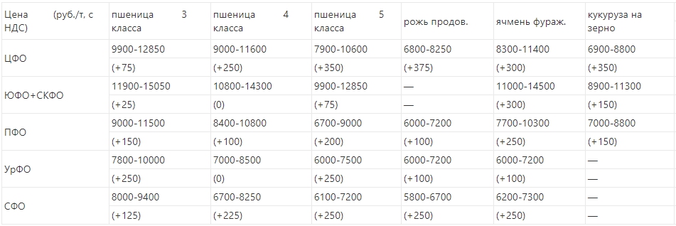 На прошлой неделе ценовые показатели зерновых культур преимущественно росли. Так, в ЦФО пшеница 3-го и 4-го классов подорожала в пределах 75–250 руб./т, продовольственная рожь – на 375 руб./т, пшеница 5-го класса и кукуруза на зерно – на 350 руб./т, а фуражный ячмень прибавил в стоимости 300 руб./т.