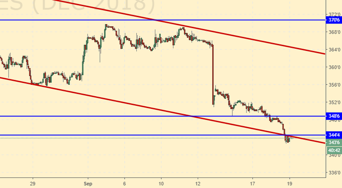 Кукуруза: если цены не могут идти вверх, они идут вниз. Рынку понравилось сидеть под 350.0. Кроме того, мы как бы между делом вышли вниз из падающего канала, а такое поведение предполагает движение вниз на ширину этого самого канала (20 центов), то есть в район 320.0. Имеет смысл удерживать открытые вчера шорты. Фундамент по кукурузе, что отмечалось нами и ранее, крайне слабый. Он просто никакой. На рынке изобилие. Плюс к этому, очередной виток торговой войны между США и Китаем.