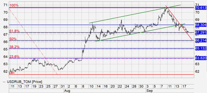 Рубль: когда техника работает — это плюс самому рынку. Резких движений нет, колебания находятся у среднедневных значений. Красота, торгуй, не хочу. Рубль продолжает укрепляться, и отметка 65.20 может быть достигнута в рамках коррекционного хода к концу следующей недели. На пути у нас есть препятствия на 67.30 и 66.20, но они, вероятно, будут преодолены. А вот через 65.20 пройти будет непросто, практически невозможно, так как это нижняя граница растущего ценового канала. Пока рассчитываем на укрепление национальной валюты.
