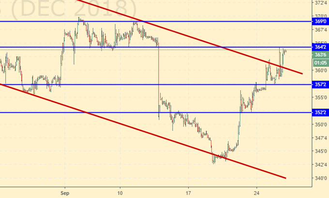 Кукуруза: а вот здесь нам с продажами не повезло. Рынок ушел выше 362.0, продолжая настаивать на том, что ему очень надо вверх. Вдалеке у нас 430.0, поэтому будем покупать после роста выше 365.0 (есть подозрения, что взять этот уровень рынок не сможет, вчера очень сильно быков попросили вниз от него), расположив стоп под 357.0 и отмечая про себя, что место для входа далеко не самое эффективное, так как заходим на пробое канала, да и расстояние до стоп-ордера очень велико, значит много лотов не возьмешь из-за контроля за рисками. Но когда рынок уходил ниже 350.0 покупать, пытаясь «нащупать» дно было просто опасно.