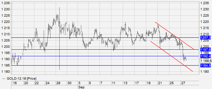 Золото: рынок не выдержал собственного веса и провалился. Ближайший уровень поддержки 1185. Если он будет пробит, то придется вспоминать об уже позабытых уровнях на 1150 и 1120. Если цена вернется к 1200, то можно продать. В случае продолжения безостановочного падения данный тренд лучше пропустить. В связи с повышением ставки в США и при этом продолжающегося роста американских и европейских бирж, участники рынка не увидели возможности для продолжения покупки золота.