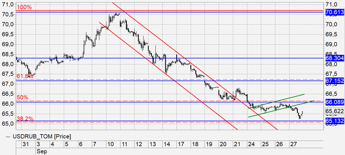Рубль: вчера вечером мы коснулись 65.24 и немного приподнялись. Здесь надо покупать, так как внизу уже идет граница растущего ценового канала. В случае пробоя ниже, скажем, 64.00, укрепление рубля может продолжится вплоть до 60.00. Впереди выходные, как правило, трейдеры или закрывают позиции, или переходят в доллар, поэтому сегодня мы ждем роста доллара. Возможно, что к концу следующей недели мы окажемся на 67.15.