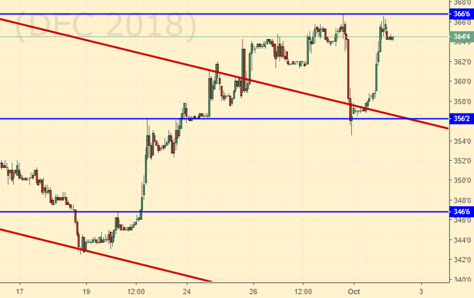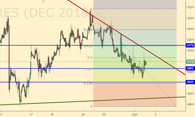 Пшеница: видим повторную попытку пробиться ниже 506.0, которая пока успехом не увенчалась. Рынок стабилизировался. Если будет проход выше 520.0, то можно купить. Во всех остальных случаях держим шорты и смотрим на 450.0, пусть у нас и появились некоторые сомнения в возможностях медведей продавить рынок. На следующие пять месяцев рынок будет отдан в распоряжении спекулянтов, так как с окончанием сбора урожая фундаментальные факторы иссякли. Осталось только считать. Кстати, стоимость пшеницы (4 класс) c элеватора в России (EXW) сейчас выше, чем пшеницы SRW на бирже в Чикаго. Такое случилось в первый раз за пять лет. Так что на текущий момент цены более чем справедливы внутри страны.