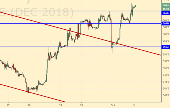 Кукуруза: после весьма подозрительной (очень резко и безоткатно) коррекции к 355.0, вчера цены продолжили свой рост. Нам не удалось расшифровать сей хитрый замысел, остается надеяться, что кто-то из читателей сделал это самостоятельно. Теперь только вверх. Пока мы выше 360.0 можно покупать в любом месте. Цели данного движения находятся на отметке 400.0.