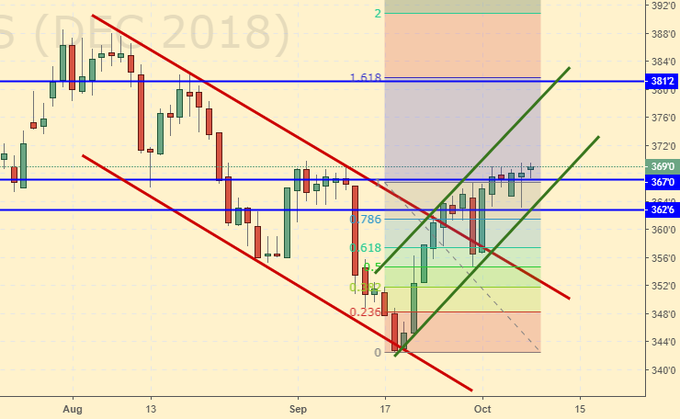 Кукуруза: кукуруза забралась выше 360.0 и очень хочет сходить к 380.0, а затем и к 400.0, но не может. Пока не пускает гигантский урожай. Может быть сегодня мы все-таки прорвемся вверх, так как за всю прошедшую неделю, мы так и не смогли уйти ниже 360.0. Если рынок не падает на протяжении нескольких дней, то он идет вверх. От кукурузы ждем роста сегодня.