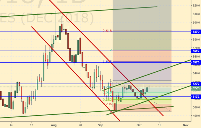 Пшеница: если быки именно сегодня хотят покорить белый свет, то им надо прорываться выше 530.0. В противном случае, темп роста цены снова будет потерян, и мы рискуем вместо 600.0 увидеть 450.0. На фоне достаточно обильного урожая покупатели такие как Турция и Египет не спешат брать все подряд, предъявляя к качеству зерна высокие требования. Да, их, можно понять, однако, как только объемы пойдут на спад, уже в этом году рекорда по сбору нет, в следующем также все под большим вопросом, уровень претензий покупателей будет снижаться. Именно будущий год начинает беспокоить трейдеров, так как если пшеница растеряет еще 25.2 млн. тонн (разница между текущим и прошлогодним валовым сбором), то цены будут никак не ниже 600.0 центов за бушель.