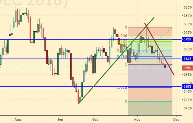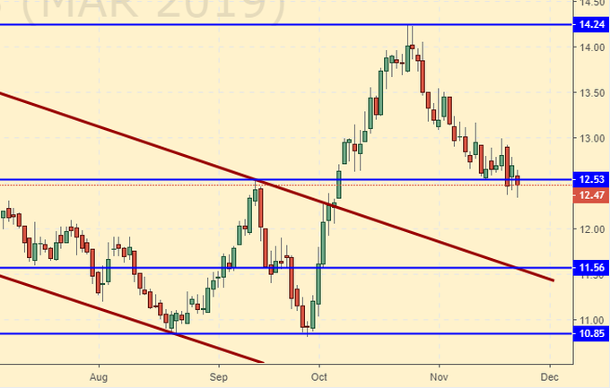 На рынке зерновых продолжается затишье. Вялые попытки роста были отвергнуты толпой. Никто не хочет ставить против больших запасов. В складывающихся обстоятельствах до середины декабря поводов для роста не будет. Может быть декабрьский отчет USDA даст пищу для размышлений, но до него еще нужно дожить. А пока цены находятся под давлением, что по пшенице, что по кукурузе.