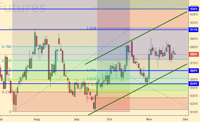 Сценарий роста: рассматриваем сентябрьский фьючерс, дата экспирации 14 декабря. Если бы рынок всегда действовал так, как мы ему пишем на неделю вперед, жизнь была бы прекрасна. Стоп на 878.0 перестал существовать. Существует угроза хода к 860.0. Там будет борьба. Вот там и можно будет купить.