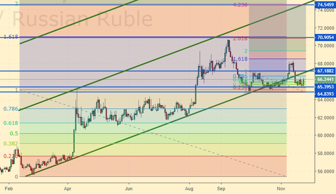 Сценарий падения: при подходе к 67.00 надо продавать. Не ясен посыл на котором мы сможем подняться выше. Конечно, смотрим на нефть, если там дело пойдет к 40.00, вот тогда станет не по себе и мы улетим к 70.00. При более спокойных вариантах развития событий мы должны окрепнуть до 60.00.