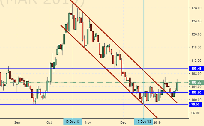 Сценарий роста: рассматриваем мартовский фьючерс, дата экспирации 19 марта. Кое-как мы отходим от 100.0. Радует то, что тренд разгоняется. Практически наверняка мы будем на 110.0. Возможен и более сильный рост, поэтому, надо набраться терпения и сидеть в позиции.