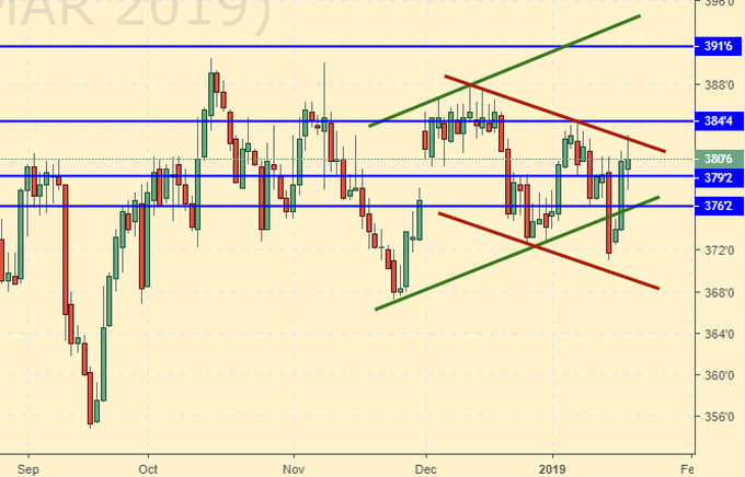 Сценарий роста: рассматриваем мартовский фьючерс, дата экспирации 14 марта. Маркетмейкеры «призывают» нас торговать широко. С далекими стоп-ордерами, с большими рисками в пунктах, что означает малую долю прибыли по капиталу в случае если вы следите за рисками. Пусть рынок поднимется выше 385.0. Там и будем покупать.