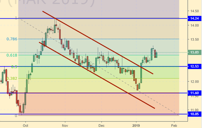 Сценарий роста: рассматриваем мартовский фьючерс, дата экспирации 28 февраля. Здесь пока все нормально. Мы оттолкнулись от 11.70 и пошли вверх. Продолжаем считать, что текущая ситуация может стать сделкой года по сахару, при условии, что мы преодолеем в перспективе 14.24.