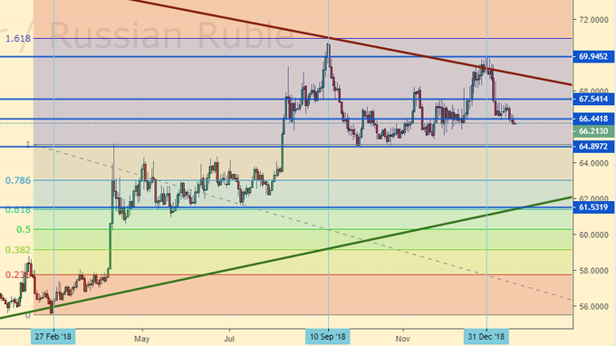 Сценарий роста: ушли мы ниже 66.40. Дальше 65.00. Потом 64.00, потом 62.00. У быков по доллару пока ничего нет. Если нефть будет стоять, то профицит торгового баланса сделает свое дело и рубль продолжит укрепляться.
