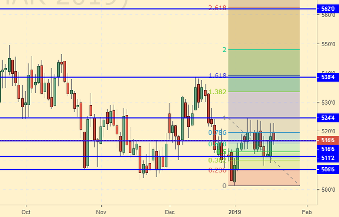 Сценарий роста: рассматриваем мартовский фьючерс, дата экспирации 14 марта. Рынок сохраняет шансы на рост. Красивый вход в позицию усложняют весьма сильные колебания. Перед нами тут едва ли не «высокие волны», что при условии нахождения рынка в растущем тренде означало бы разворот. В данном же случае это просто борьба под уровнем 524.4. Купить можно, но стоп на 504.0, а это далеко. Внимательно считайте риски.