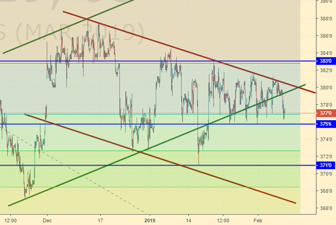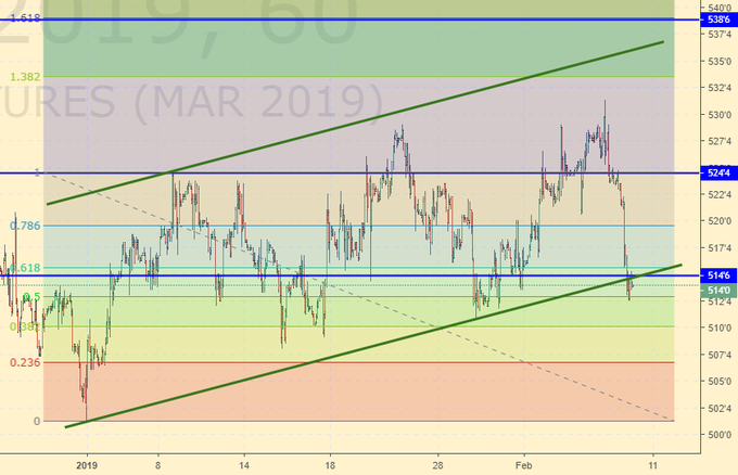 Кукуруза: сместились к 375.0. Это неплохо, учитывая наши рекомендации не покупать пока мы ниже 385.0. Здесь надо просто держать шорты в расчете на то, что кукуруза последует за пшеницей, потом пшеница последует за кукурузой и эта цепная реакция в итоге отбросит цены процентов на 15 вниз от текущих значений. Видимо, с Китаем не все так просто. Не хочет Поднебесная сдаваться без боя. Для рынков это негативный фактор. Но ждем. Сегодня только 8-е число. До 1-го марта время еще есть.