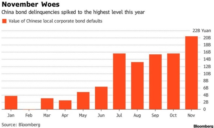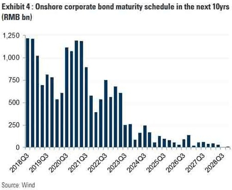 На этом фоне устрашающе выглядит график погашения облигаций: корпоративные облигации на триллионы юаней должны быть погашены в следующем квартале, что фактически гарантирует новые и новые дефолты.