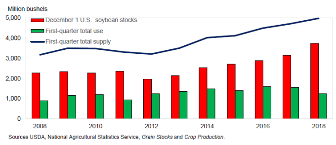 Рисунок 1. Декабрьские остатки сои в США достигли рекордно высокого уровня.