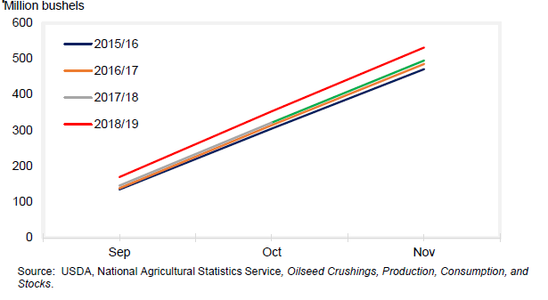 В своем отчете об урожае в этом месяце Министерство сельского хозяйства США сообщило, что оценка урожая сои в США в 2018/19 году составила 4,544 млрд. бушелей, что на 56 млн. бушелей меньше предыдущей оценки. Уборочная площадь соевых бобов была пересмотрена в сторону понижения с 88,3 млн. до 88,1 млн. акров (что обусловлено дальнейшим отказом от затопленных площадей в Луизиане). Кроме того, средняя урожайность сои в стране в 2018/19 году была снижена на 0,5 бушеля до 51,6 бушелей на акр, с сокращениями в Южной Дакоте, Небраске, Айове и Индиане. Несмотря на это, урожай этого сезона превосходит предыдущий рекорд 2017/18 года на 132 миллиона бушелей. Урожай в сочетании с большими переходящими остатками на 1 сентября увеличивает общие запасы 2018/19 года до рекордных 5 млрд. бушелей.