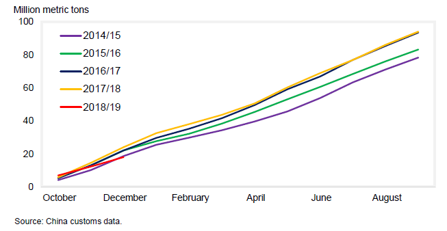 Только за декабрь 2018 года импорт упал на 40 процентов по сравнению с предыдущим годом. Совокупные темпы переработки сои в Китае в первом квартале 2018/19 года существенно отстают от предыдущего года, что привело к тому, что USDA сократило свой прогноз переработки в 2018/19 году в этом месяце на 3,5 млн. тонн до 89 млн. тонн. Прибыльность переработки соевых бобов в Китае была снижена из-за слабого использования соевого шрота, поскольку в кормовых рационах был сокращен общий уровень протеина и заменен другими источниками протеина. Таким образом, прогноз импорта сои в Китай в 2018/19 году снижен на 2 млн. тонн в этом месяце до 88 млн. до трехлетнего минимума.