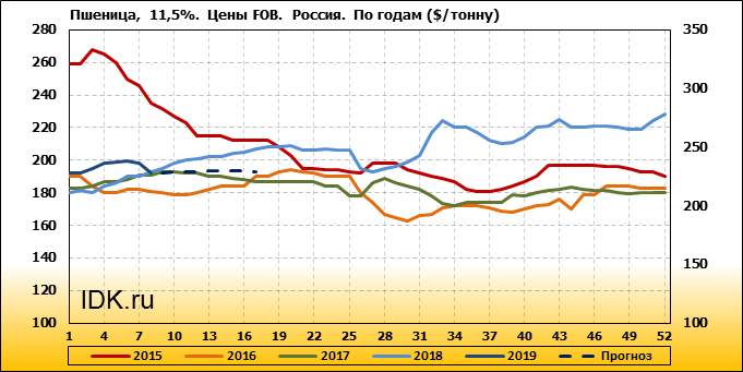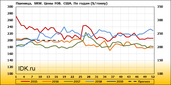 Международный совет по зерну (IGC) сократил свой прогноз мирового производства пшеницы в 2018/19 году на 2 млн. тонн до 735 млн. тонн. Экспорт российской пшеницы в сезоне 2018/19 был пересмотрен в сторону повышения до 34,3 млн. тонн с 33,5 млн., причем Россия увеличивает долю на рынке за счет США (28 млн. тонн с 28,5 млн.) и Европейского Союза (19,5 млн. тонн с 19,8 млн). Прогноз глобальных конечных запасов пшеницы снизился на 1 млн. тонн до 262 млн. тонн, что на 3,4% меньше, чем в прошлом сезоне, в основном за счет Китая, но это все еще второй по величине показатель в истории.
