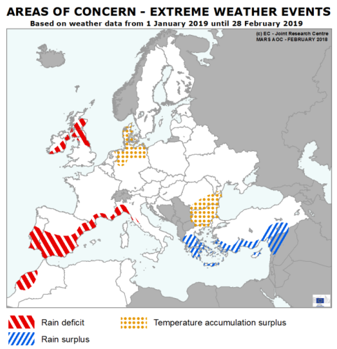 Вследствие преимущественно мягких погодных условий ущерб от заморозков пока незначителен. Однако из-за тех же мягких погодных условий низкотемпературная акклиматизация озимых злаков (зимняя закалка) остается слабой на обширной части Европы. Согласно модельному расчету MARS, с конца января морозоустойчивость ослабла в регионе между восточной Францией и западной Польшей, а также в Карпатском бассейне, северной половине Балканского полуострова и западной половине Турции. Нынешние низкие уровни закаливания в Германии и Дании, а также на юге Румынии и в северной части Болгарии являются редкостью и вызывают некоторую обеспокоенность в связи с возможным ущербом от вымерзания в случае серьезного похолодания. Тем не менее, в течение прогнозируемого периода (до конца февраля) не ожидается дальнейших потерь от заморозков, несмотря на ожидаемое похолодание в Балканском регионе.