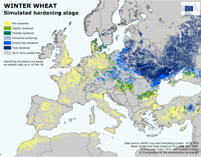 Озимые зерновые слегка или частично закалены в Карпатском бассейне и в северной половине Балканского полуострова, где устойчивость к низким температурам начала ослабевать в течение более мягкой, чем обычно, первой декады февраля. В середине февраля такой низкий уровень закаливания в Германии и Дании, а также на юге Румынии и в северной Болгарии является редким явлением и вызывает обеспокоенность по поводу возможного повреждения от замерзания в случае сильного похолодания.