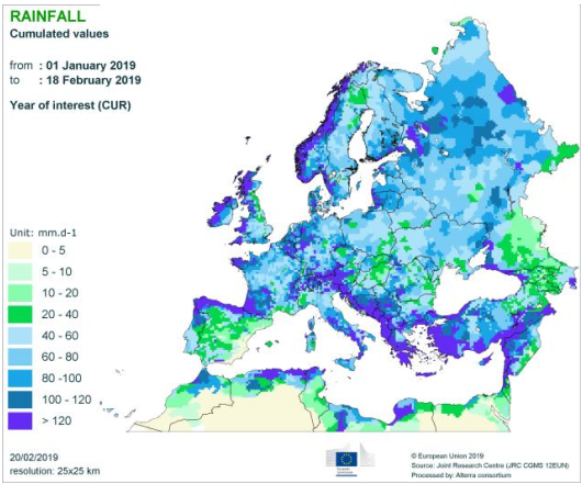 В нескольких частях Европы отмечен дефицит осадков. Это было наиболее выражено в значительной части Пиренейского полуострова и в западной части региона Магриба, где количество осадков было значительно ниже среднего с начала декабря. Дождь будет необходим в этих регионах для восстановления запасов почвенных и подземных вод по мере приближения весны. На данный момент эти сухие условия, в основном, не представляют собой угрозу для сельскохозяйственных культур.