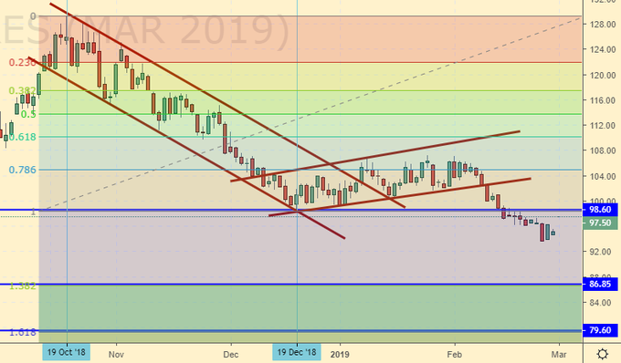 Сценарий роста: похоже зимняя песня дорогой нефти на прошлой неделе закончилась. Добыча в США продолжает расти. Добыча в России также растет. Сокращения со стороны ОПЕК выглядят смехотворно. Роста российской экономики и роста инвестиций в страну никто не прогнозирует. Маячат новые санкции на горизонте. Такое публичное попихивание ногами отдельно взятой экономики отдельно взятой страны. Это застой. Катастрофы не будет. Но как расти рублю на таком фоне.