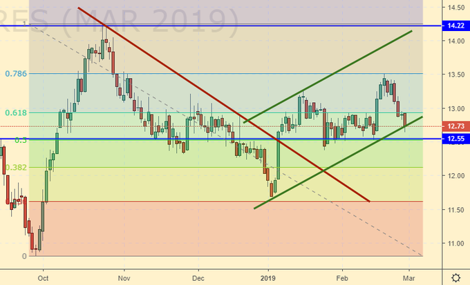 Сценарий падения: очень-очень вероятно, что перед нами коррекция. Если мы уйдем ниже 12.50 –будем продавать. Такое ощущение, что у всей товарной группы на прошлой неделе закончился кислород. Видимо, нас ждет нешуточное укрепление доллара.