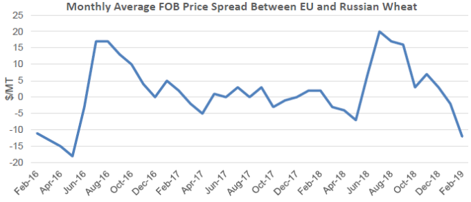 Экспорт пшеницы из ЕС начинает улучшаться после низкого уровня на протяжении большей части первой половины 2018/19 г. В течение июля-декабря 2018 года экспорт из ЕС с трудом конкурировал с рекордными темпами российского экспорта. Цены на пшеницу в ЕС обычно торгуются с премией к российским ценам, особенно в течение последних 2 лет, поскольку запасы в России были необычайно высокими. Однако в последние месяцы российские запасы сократились, а цены стали менее конкурентоспособными. Пшеница в ЕС, с другой стороны, подешевела и теперь демонстрирует самый большой ценовой дисконт к российской пшенице с мая 2016 года.