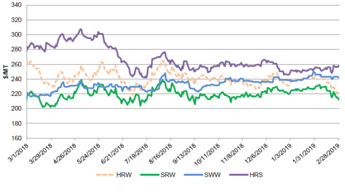 Цены на пшеницу в США в основном снижались в течение февраля на фоне продолжающейся сильной международной конкуренции. Цена Hard Red Winter (HRW) упала на 17 долларов за тонну до 223 долларов, Soft Red Winter (SRW) снизилась на 15 долларов за тонну до 212 долларов, а Soft White Winter (SWW) потеряла 7 долларов за тонну. С другой стороны, Hard Red Spring (HRS) выросла на 4 долл. США / т до 258 долл. США из-за связанных с погодой логистических задержек в северной части Соединенных Штатов.