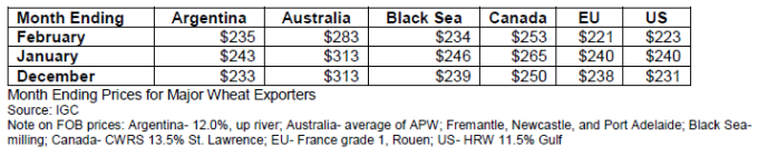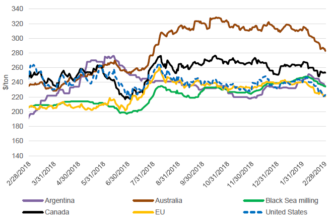 В феврале котировки экспортеров в основном снижались на фоне жесткой рыночной конкуренции и сообщений о хороших условиях для новых посевов в ключевых странах Северного полушария. Черноморские цены снизились в относительно меньшей степени, чем у других поставщиков, что повысило конкурентоспособность пшеницы в ЕС и США. Ожидается, что как в Европейском Союзе, так и в Соединенных Штатах будут наблюдаться более высокие темпы экспорта в ближайшие месяцы из-за сокращения запасов в Черноморском регионе и более конкурентоспособных цен. Цены в Австралии упали больше всего в феврале, но остаются высокими по сравнению с другими крупными экспортерами.