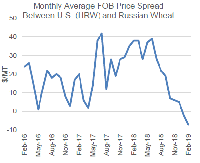 После того как запасы пшеницы в России сократились, конкурентоспособность пшеницы США улучшилась. Впервые за 5 лет американская HRW имеет более низкую цену, чем российская пшеница. В последние годы и Россия, и Европейский Союз значительно продвинулись на рынки Западного полушария, особенно в Мексику. Однако, учитывая текущие ценовые соотношения и логистическое преимущество, которым обладает пшеница США, эта конкуренция, вероятно, будет минимальной в ближайшие месяцы.