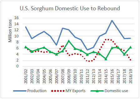 Только год назад более половины производства США ушло на зарубежные рынки. Однако, согласно прогнозу, в этом году будет экспортировано около четверти производства. На самом деле, темпы продаж и поставок были медленными в связи с отсутствием закупок Китая с начала маркетингового года (сентябрь 2018 — август 2019). Вскоре после отмены предварительных антидемпинговых и компенсационных пошлин Китай ввел 25-процентный тариф на американский сорго в ответ на торговые действия США. Хотя американский сорго остается конкурентоспособным даже с учетом пошлины, торговая напряженность и коммерческий риск уничтожили потенциальный спрос. Продажи и поставки на другие рынки, в частности в Испанию, Японию и Мексику, были стабильными, но их величина относительно невелика. Более того, большие экспортные запасы кукурузы в Аргентине, Бразилии и Украине продолжают снижать потребность в американском сорго.