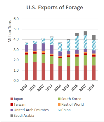 Соединенные Штаты являются крупнейшим экспортером фуражной продукции в мире и удерживали эту позицию до конца 2018 календарного года. Япония, Южная Корея, Тайвань и Объединенные Арабские Эмираты (ОАЭ) исторически были наиболее важными направлениями экспорта кормовой продукции США, но в течение последнего десятилетия Саудовская Аравия и Китай также стали рынками с высоким кормовым спросом. Австралия и Европейский Союз продолжают оставаться крупнейшими конкурентами для кормов США на зарубежных рынках. Поскольку цены на корма в США традиционно выше, чем на экспорт кормов из других стран, ЕС вытесняет американское сено в ОАЭ, в то время как географическая близость Австралии к восточноазиатским странам также позволяет ей эффективно конкурировать на этих рынках.