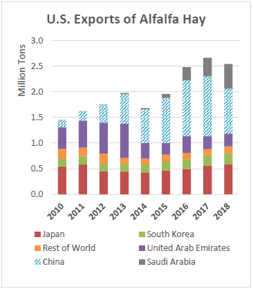 На рынке люцернового сена, специфического вида кормовой продукции, Соединенные Штаты также являются крупнейшим в мире экспортером. Под влиянием расширяющегося молочного сектора Китай превзошел Японию в качестве крупнейшего экспортного направления, и общую тенденцию к росту можно объяснить приверженностью Китая к американскому люцерновому сену, даже когда на других экспортных рынках наблюдаются признаки сокращения. США экспортировали около 2000 тонн сена люцерны в Китай в 2006 году, но открытие рынка Китая в 2008 году и последующий высокий спрос увеличили экспорт США до 1,2 миллиона тонн в 2017 году. Даже с небольшим падением экспорта из США в Китай в 2018 году в связи с сохраняющейся торговой напряженностью, он все еще является главным направлением экспорта американского люцернового сена.